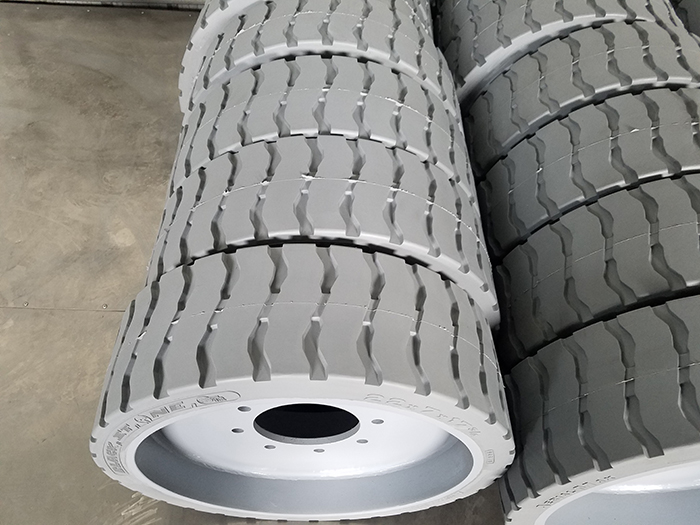 然后用吊帶或叉車安全地將實心輪胎套裝至輪毅,檢查確保輪鋼和輪毅裝配貼實,裝入螺母到螺栓頭部,然后用8-10公斤風炮機或氣動沖板手預擰緊到硬接觸,使用8-10公斤,風炮機或扭矩板手順時針、交錯、對稱分多次次擰緊輪轂螺母,直至全部達到力矩標準,用扭矩檢測板手檢測母擰緊力矩,要求為350Nm~370N,在輪栓交螺母及螺母接觸位劃標記線,示意已裝妥將工具、工裝歸位